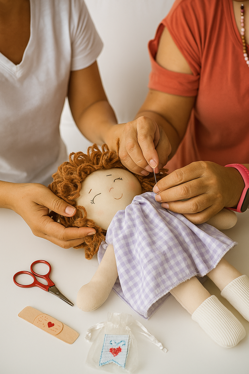 A lo largo de seis etapas, cada acción —como rellenar el cuerpo, crear un corazón, vestir la muñeca o compartir experiencias sensoriales— se convierte en una metáfora de cuidado, autoaceptación y transformación emocional.